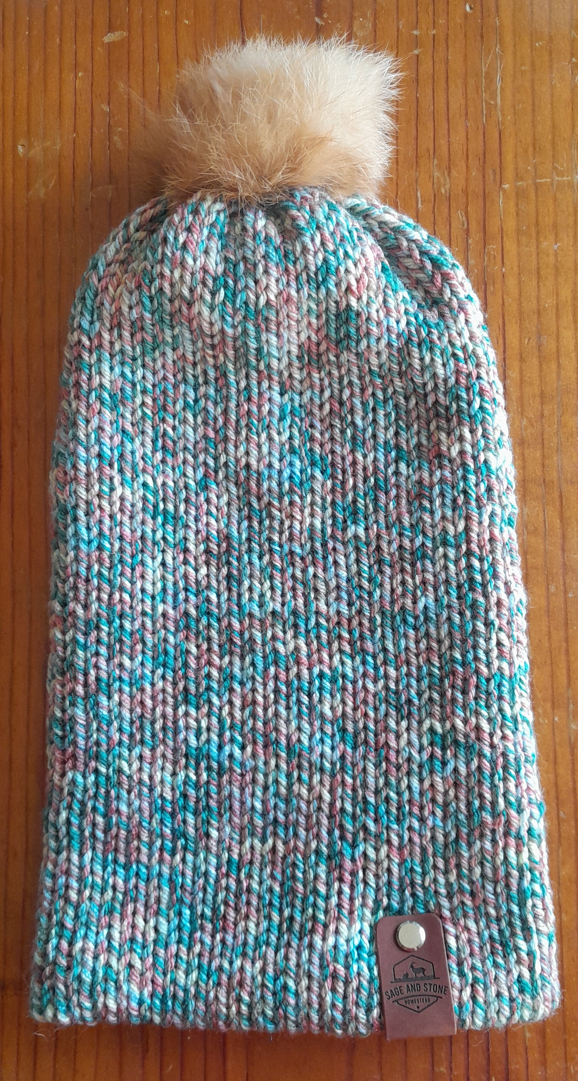 This beanie/hat/tuque was hand-crank machine knit and is a double-layer design for extra coziness! The pompom on top is genuine rabbit fur from rabbits humanely raised and processed for meat on our farm. The furs were tanned on-site and both the hats and pompoms were made by Heather.