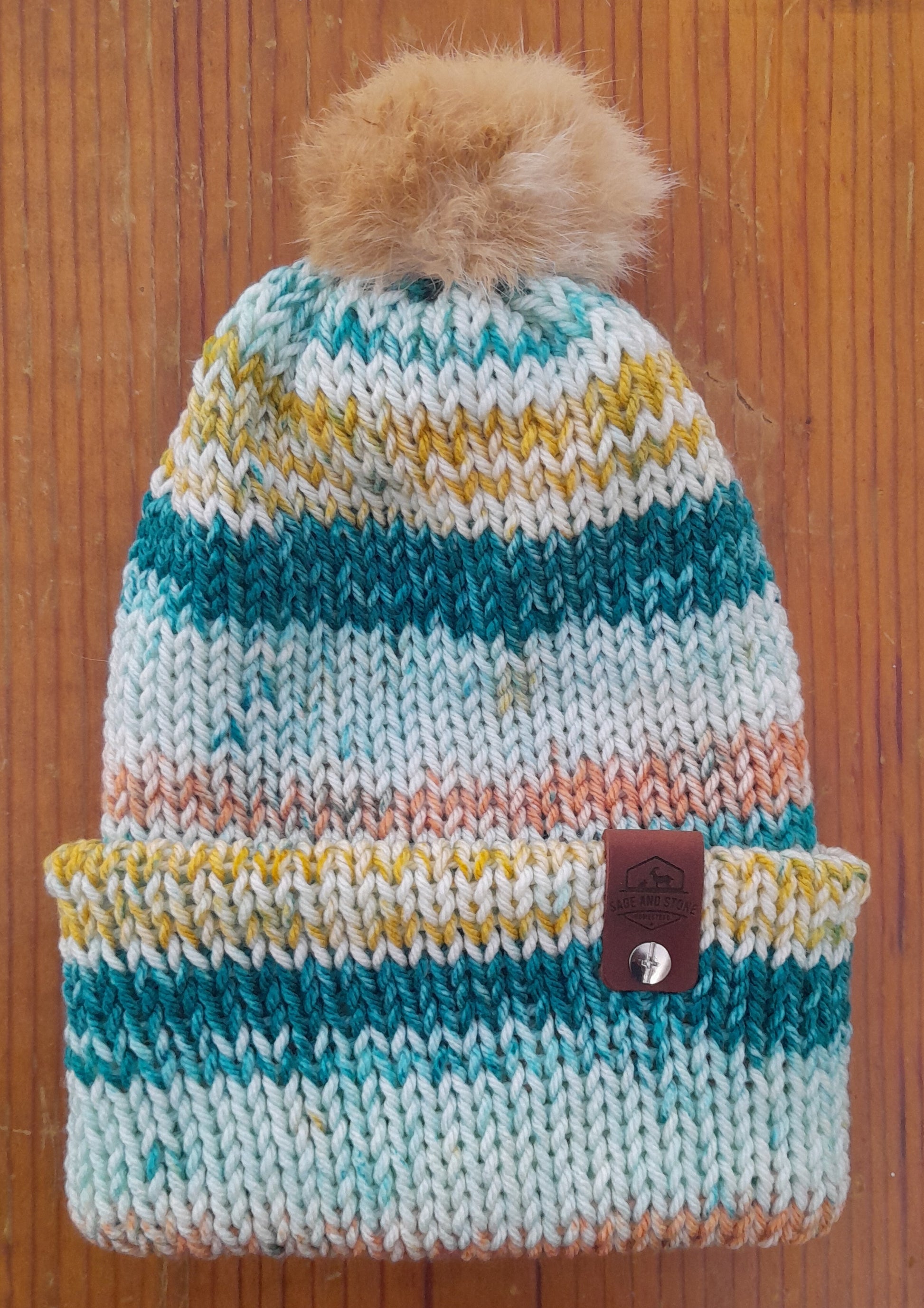 This beanie/hat/tuque was hand-crank machine knit and is a double-layer design for extra coziness! The pompom on top is genuine rabbit fur from rabbits humanely raised and processed for meat on our farm. The furs were tanned on-site and both the hats and pompoms were made by Heather.