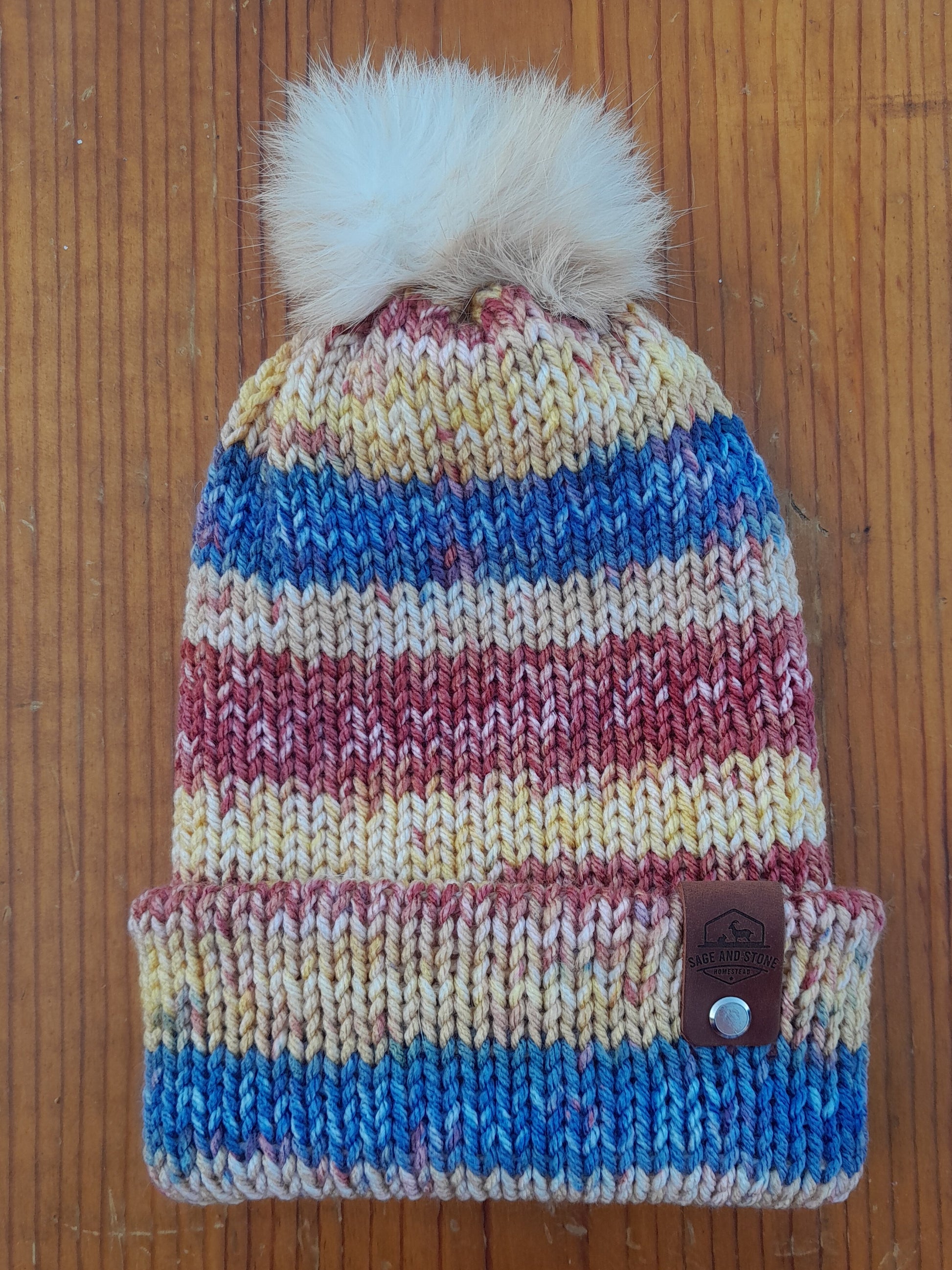 This beanie/hat/tuque was hand-crank machine knit and is a double-layer design for extra coziness! The pompom on top is genuine rabbit fur from rabbits humanely raised and processed for meat on our farm. The furs were tanned on-site and both the hats and pompoms were made by Heather.